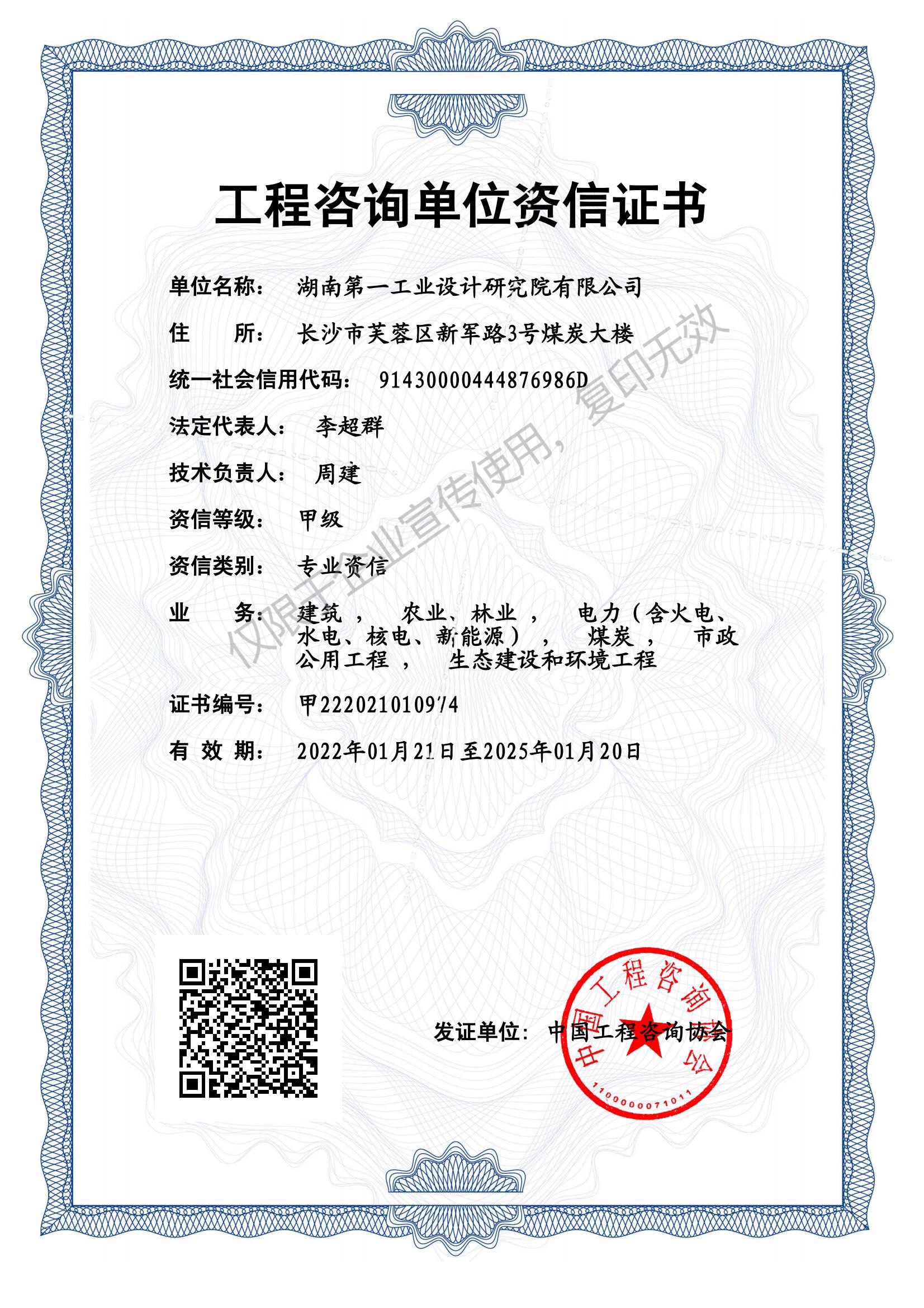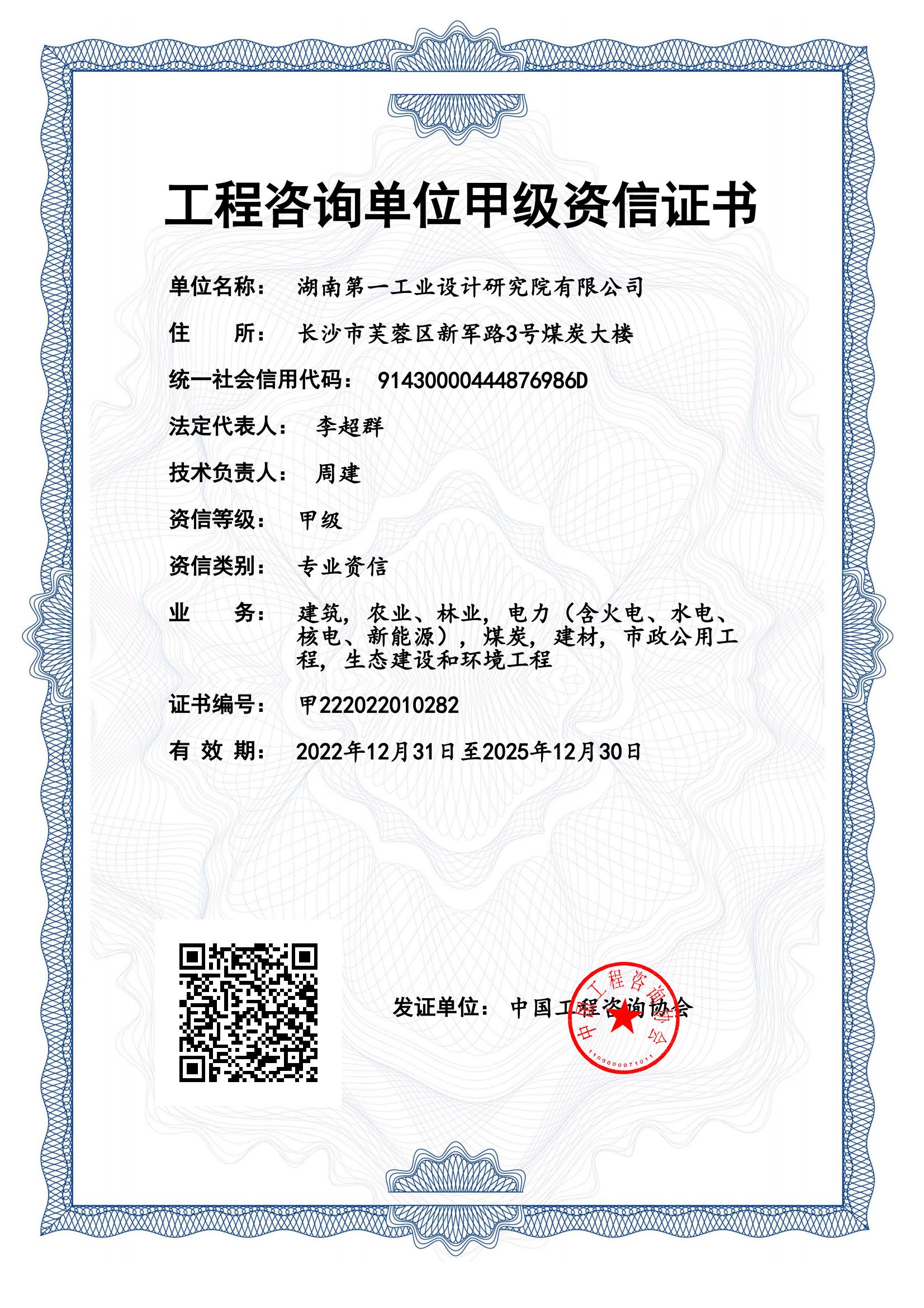工程咨詢單位甲級(jí)資信證書
