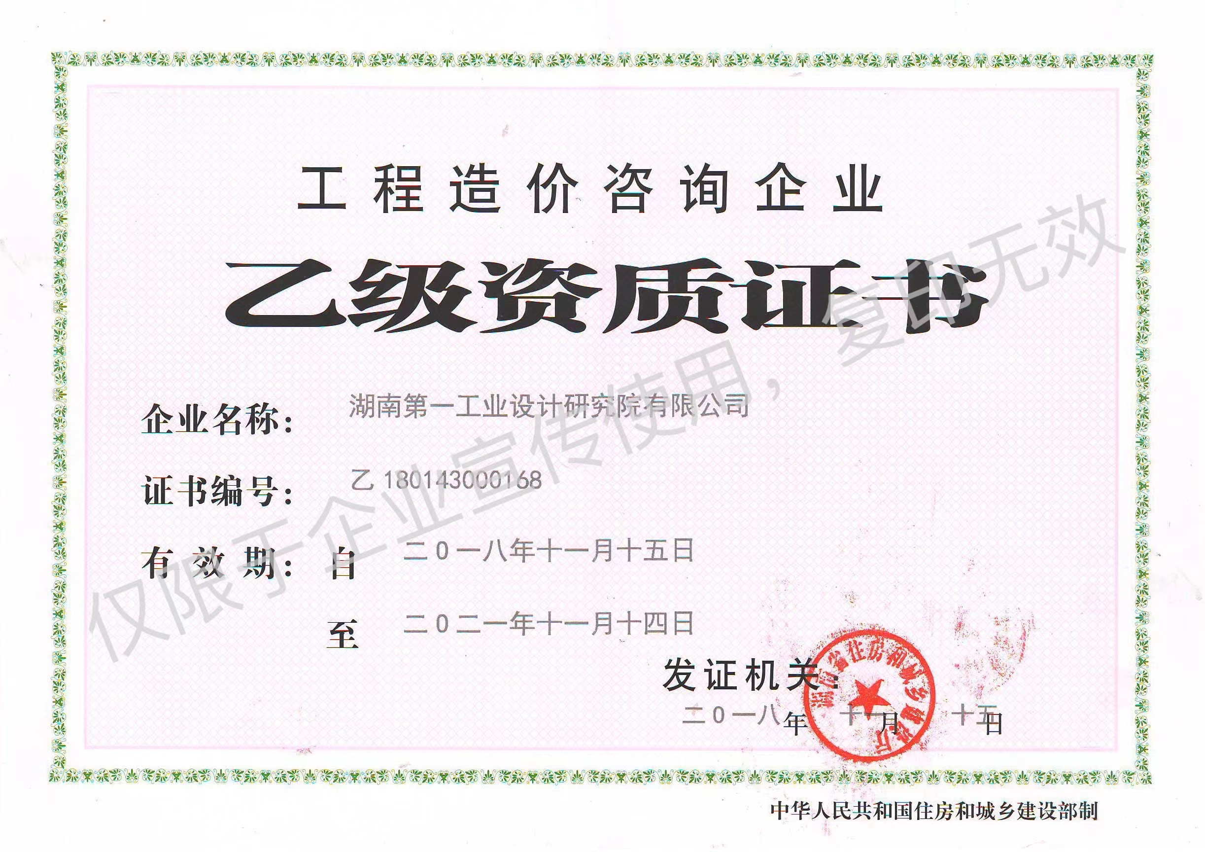 工程造價(jià)咨詢企業(yè)乙級(jí)資質(zhì)證書